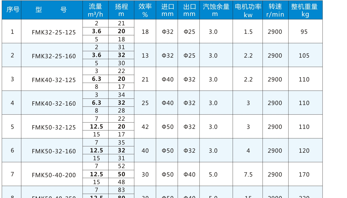 FMK:耐腐耐磨砂漿泵代號丨80:進口直徑80mm丨65:出口直徑65mm丨160:葉輪直徑125mm